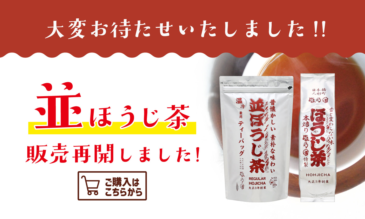 「並ほうじ茶」につきまして、昨今の全国的なお茶原料不足により、並ほうじ茶に使用している原料の入荷見通しが立たず、製造が出来ない状況下にございます。 これまで並ほうじ茶に使用していた原料に代わる茶葉を至急探しておりますが、残念ながら原料確保がままならない状況でございます。 そのため、大変申し訳ございませんがしばらくのあいだ販売休止とさせていただきます。販売再開時期は未定です。(2025.11.12更新)